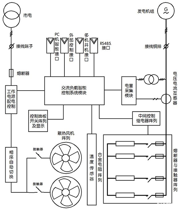 系统可与电脑配合使用,实现智能化操控,自动完成对发电机组所有电参数的专项测试,生成表格、曲线图及标准检测报告,并支持打印,全面脱离繁琐的手工操作,其工作原理图如下所示: